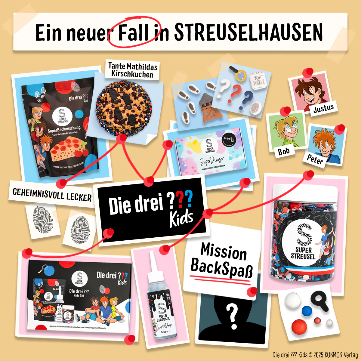 - Thematische Back-Sets und Streusel-Mixe im Look von „Die drei ??? Kids“ und „Die drei !!!“